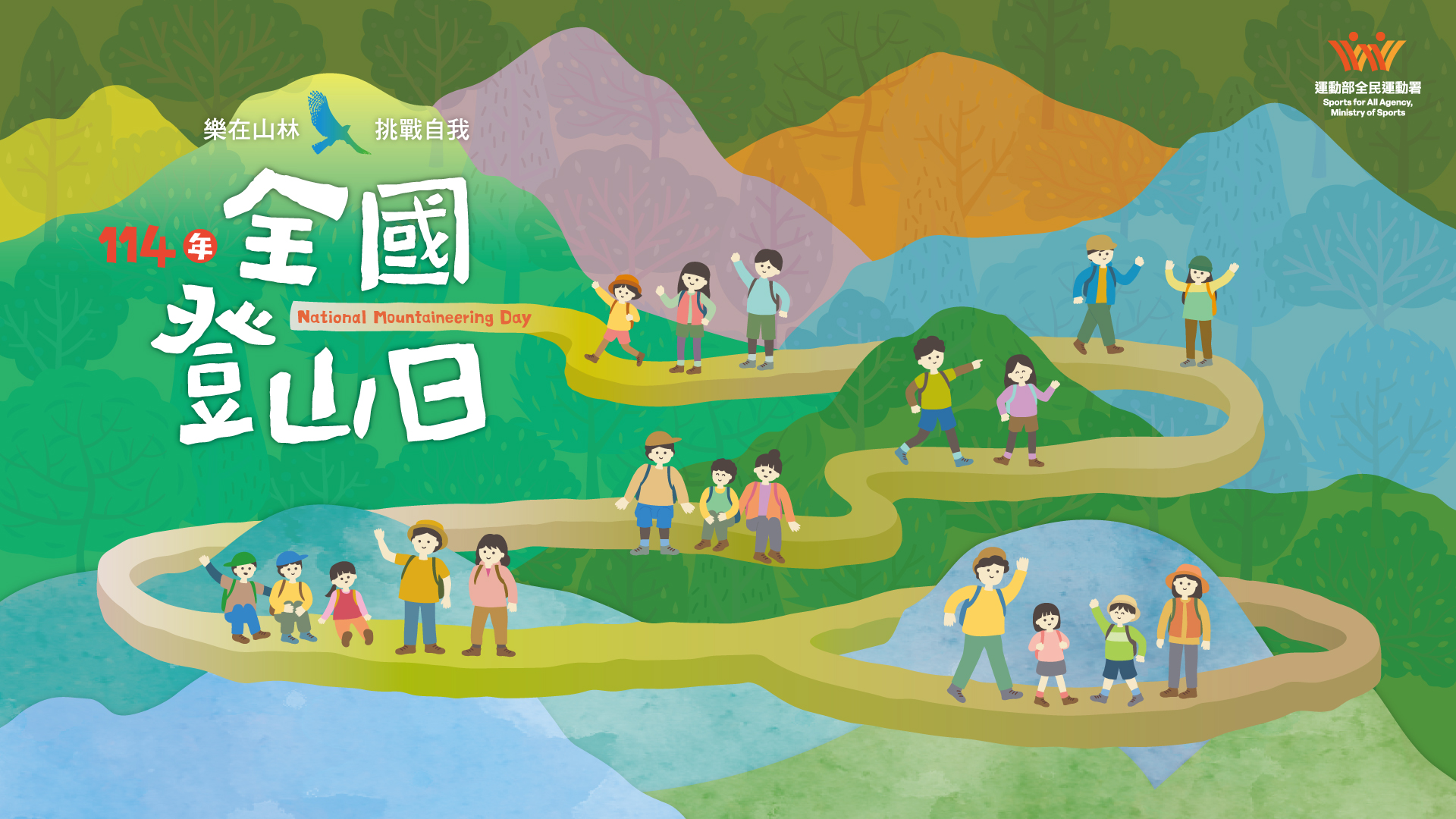 各位爸爸、媽媽、老師、同學們,全國登山日系列活動開跑了,全國登山日活動企劃特別設計「登山我在行」的活動,希望透過此活動,能讓親子、師生一起體驗登山帶來的樂趣、營造更親密的家庭與校園氛圍。請大家快趁著工作與學習的空檔,一起踏出家門、校園,體驗大自然吧!